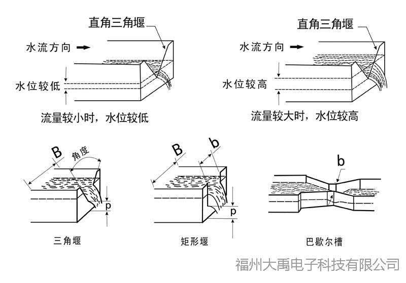 流通順暢的明渠內(nèi)流量越大,液位越高;流量越小,液位越低。通過(guò)測(cè)量水位可以推算出流量。普通明渠內(nèi)流量與水位之間的對(duì)應(yīng)關(guān)系,受渠道的坡降比和表面的糙度影響。在渠道內(nèi)安裝量水堰槽,產(chǎn)生節(jié)流作用,使明渠內(nèi)的流量與液位有固定的對(duì)應(yīng)關(guān)系,這種對(duì)應(yīng)關(guān)系主要取決于量水堰槽的構(gòu)造尺寸,把渠道的影響盡可能減小。