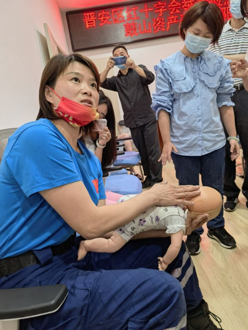 理論講解結(jié)束,再利用急救模型道具,現(xiàn)場示范模擬心肺復蘇、人工呼吸、AED操作步驟、海姆立克急救法等操作流程,理論與實踐相結(jié)合,讓大家能夠更好地理解并掌握急救要領。