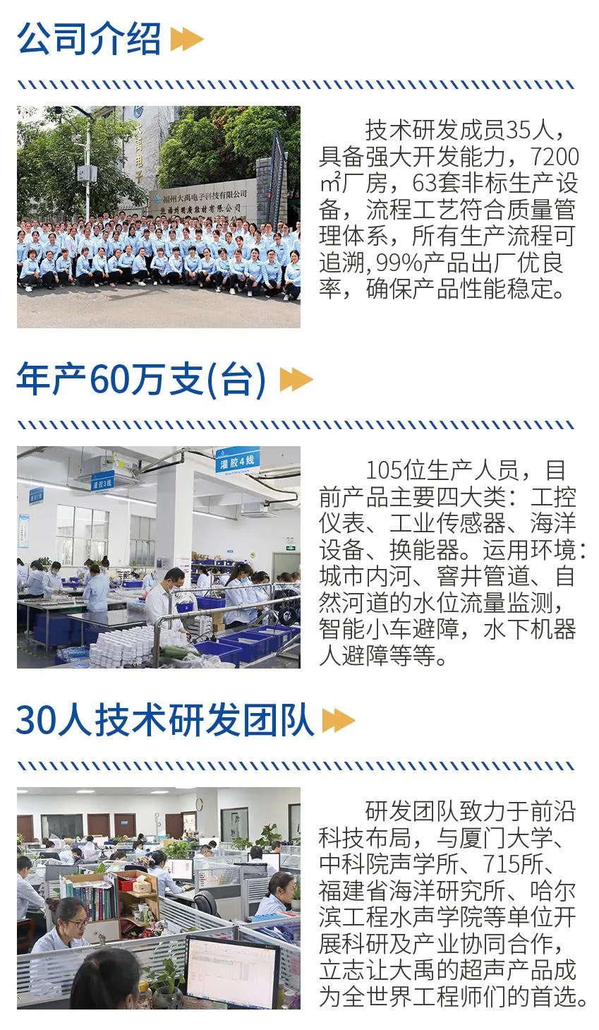 福州大禹電子科技有限公司成立于2008年自創(chuàng)辦以來(lái),專(zhuān)注超聲產(chǎn)品的研發(fā)和產(chǎn)業(yè)化,根據(jù)超聲波原理開(kāi)發(fā)各種產(chǎn)品,目前產(chǎn)品主要四大類(lèi):工控儀表、工業(yè)傳感器、海洋設(shè)備、換能器。公司產(chǎn)品應(yīng)用場(chǎng)景:超聲波產(chǎn)品,超聲波測(cè)距,監(jiān)測(cè)水位、監(jiān)測(cè)流量、水下機(jī)器人避障、水下通訊、水池水位控制。